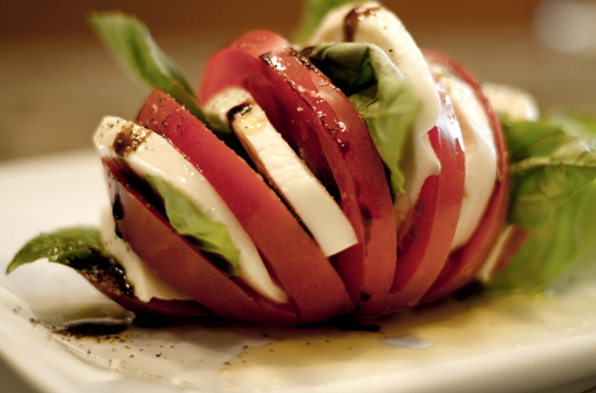 - Ensalada caprese (tomates pelados, mozzarella, anchoas y aceite alhabaca) ..... 9,95 €