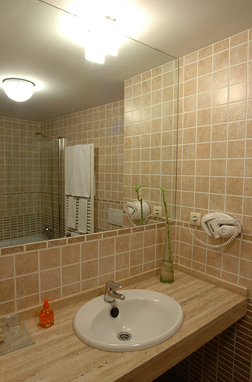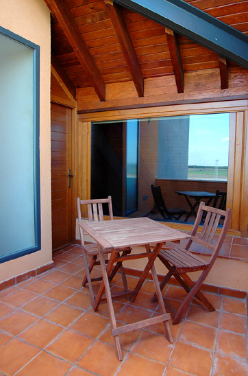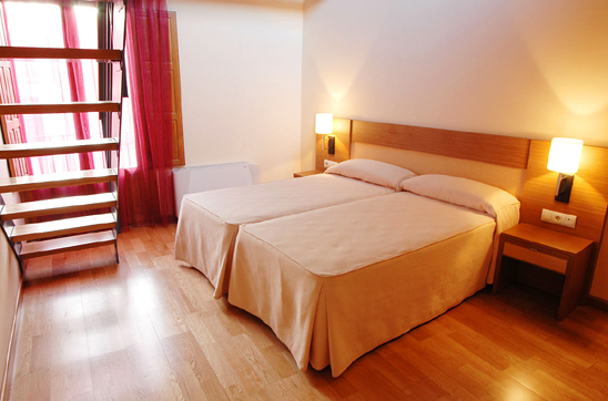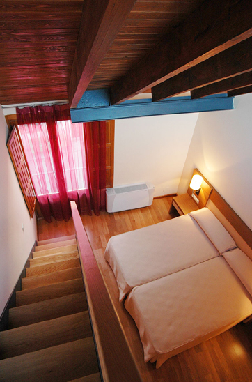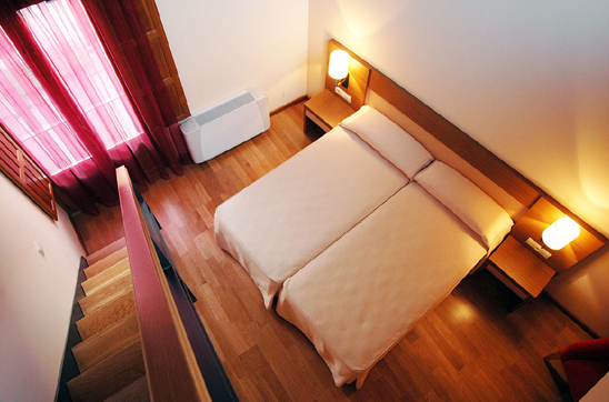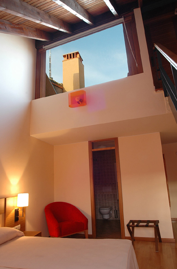 Abuhardillada, con cama king size, espaciosa, luminosa, con balcón, orientada a la fachada principal con 2 niveles; 26m2 de superficie interior y 10m2 de terraza con mobiliario de exterior (mesa y sillas), para que su estancia sea lo más cómoda y agradable posible. Incluye butaca de lectura. Baño completo con secador de pelo, espejo. TV LED de 32".